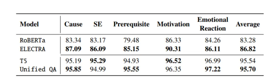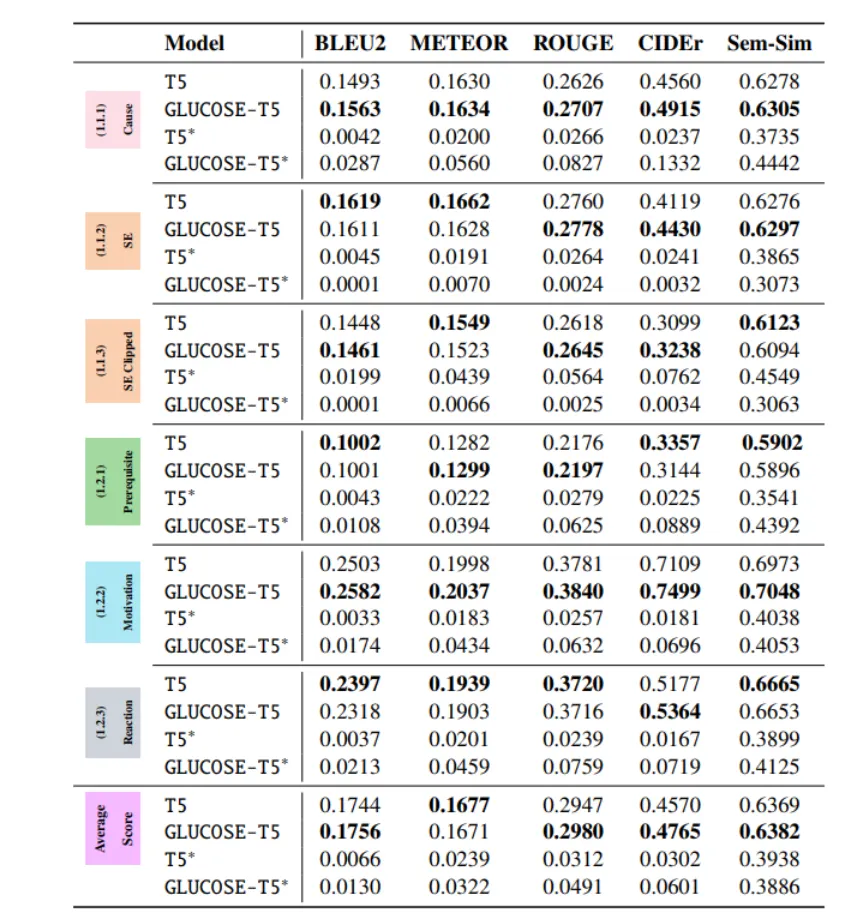 下の画像は、日常的に起こる様々なこと(人は常識的に知っていること)から、5つの状況(原因、後続事象、前提条件、内的動機、感情反応)を推論して文章を生成する課題である。