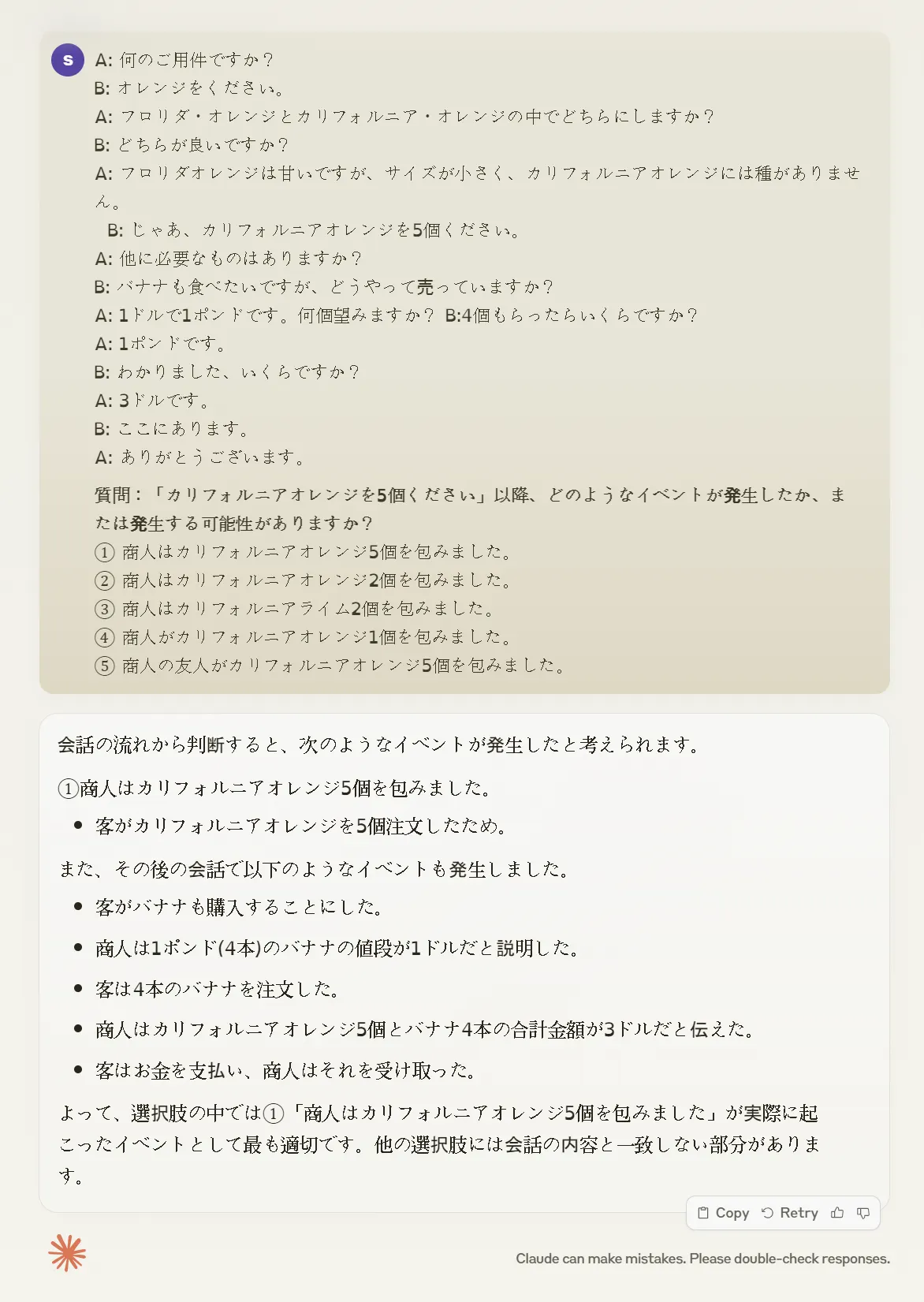 上記の質問を回答が定めらていない推論質問ではなく、文脈の中で回答を見つけられる質問にした理由は、(1)客観的な評価が可能だから、(2)文脈理解能力と想像力(A.K.A脳内推論)を区別しなければならないからである。