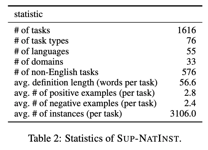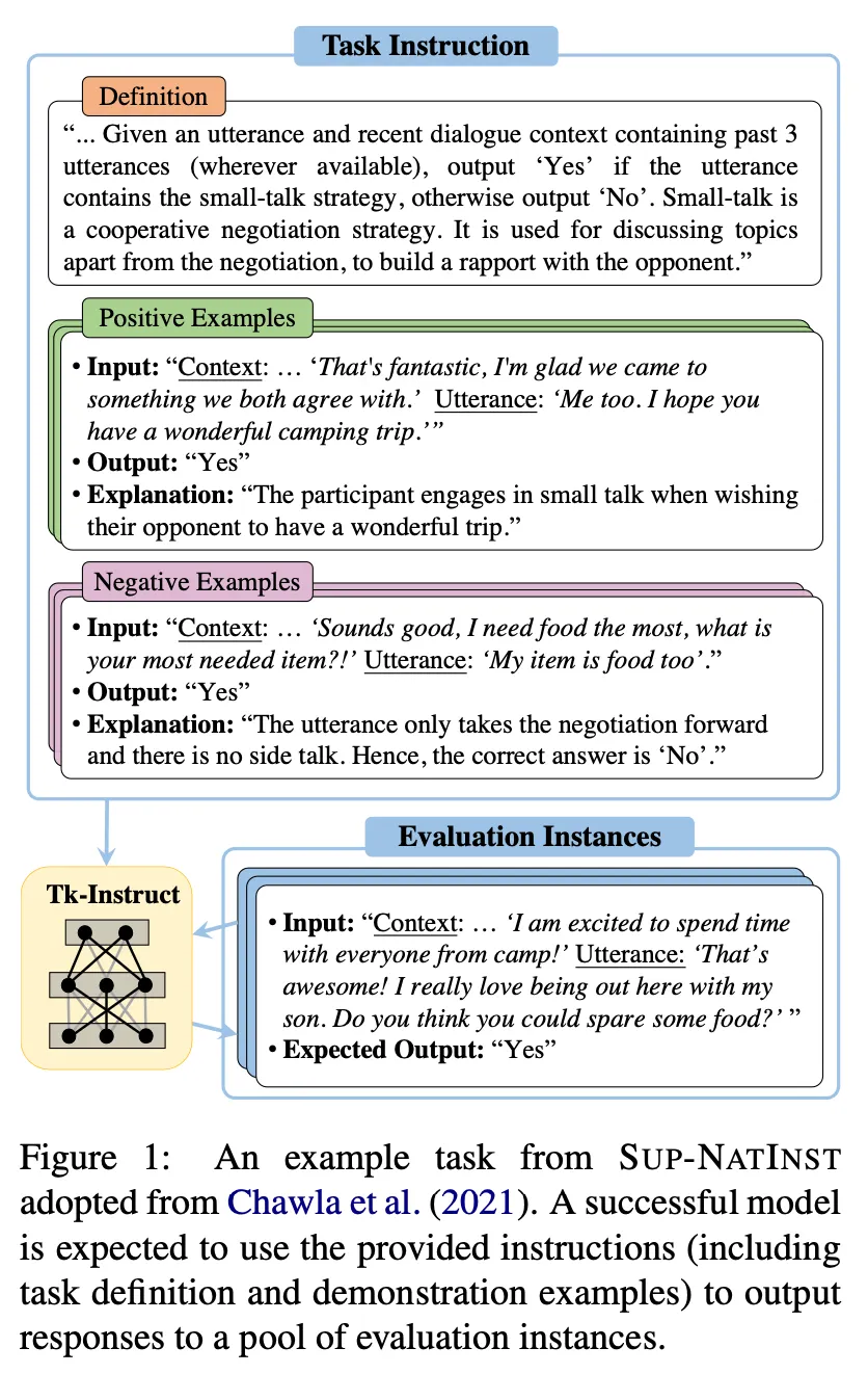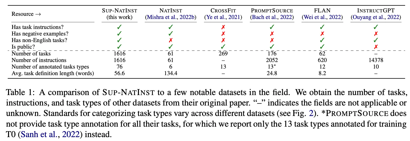 • Yizhong Wang, Swaroop Mishra, Pegah Alipoormolabashi, Yeganeh Kordi, Amirreza Mirzaei, Atharva Naik, Arjun Ashok, Arut Selvan Dhanasekaran, Anjana Arunkumar, David Stap, Eshaan Pathak, Giannis Karamanolakis, Haizhi Lai, Ishan Purohit, Ishani Mondal, Jacob Anderson, Kirby Kuznia, Krima Doshi, Kuntal Kumar Pal, et al.. 2022. Super-NaturalInstructions: Generalization via Declarative Instructions on 1600+ NLP Tasks. In Proceedings of the 2022 Conference on Empirical Methods in Natural Language Processing, pages 5085–5109, Abu Dhabi, United Arab Emirates. Association for Computational Linguistics.
