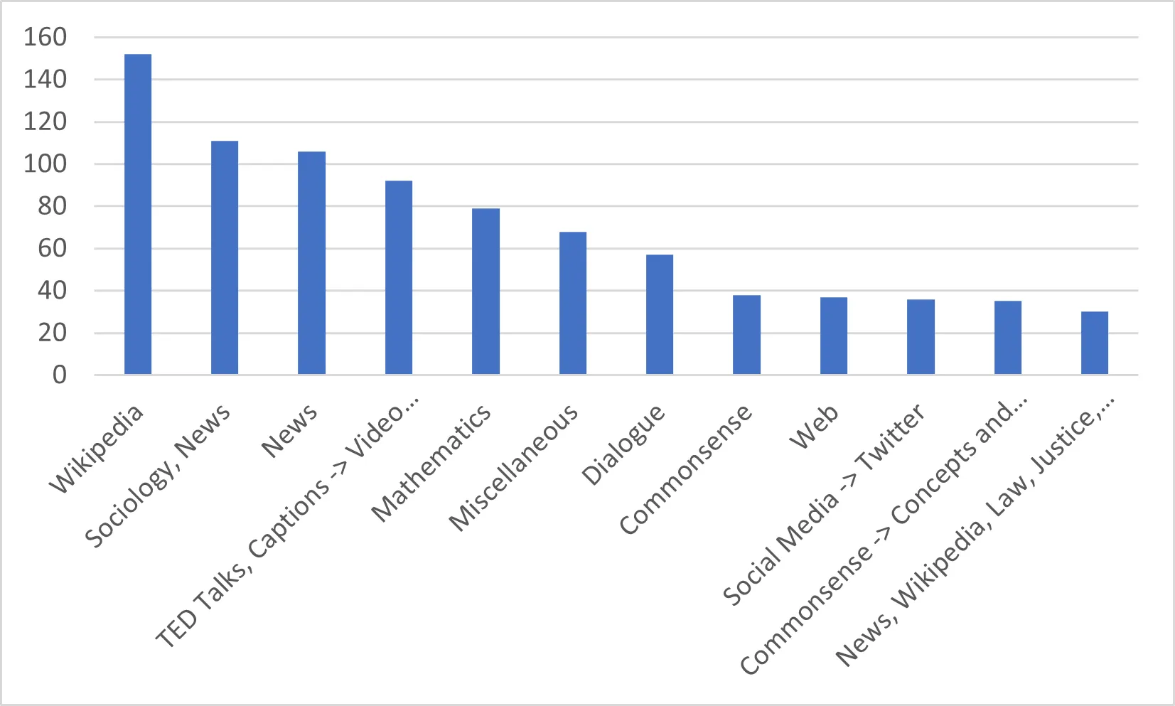 そのほか、ニュースやウィキペディアとニュースを一緒に使うことが多く、数式、会話、一般常識、SNSデータなどが多く使われている
