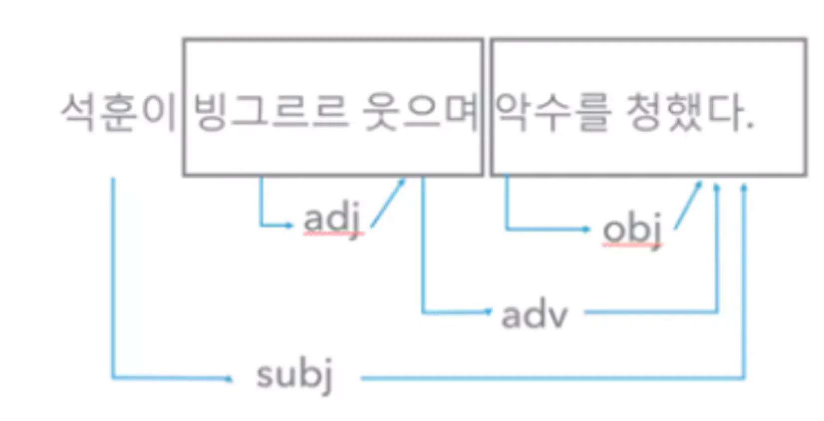 <図6>パク・ジンホ(2004)から引用、subj 主語、obj 目的語、adj 管形語、adv 副詞語