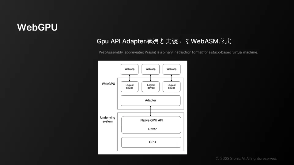 Web GPUはWebアセンブリベースで高性能のために作られた(比較的)高レベルのapi Apapterを実装している。