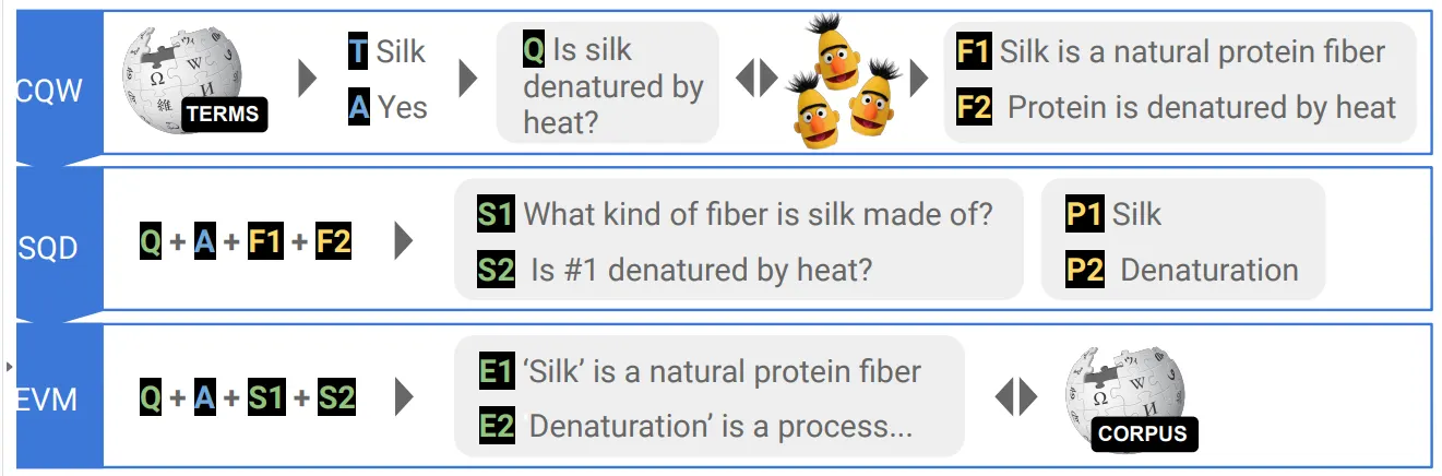 (3) (EVM, §3.3), 분해 단계에서 위키피디아에서 근거가 될만한 내용(E1, E2)과 일치하도록 구성.