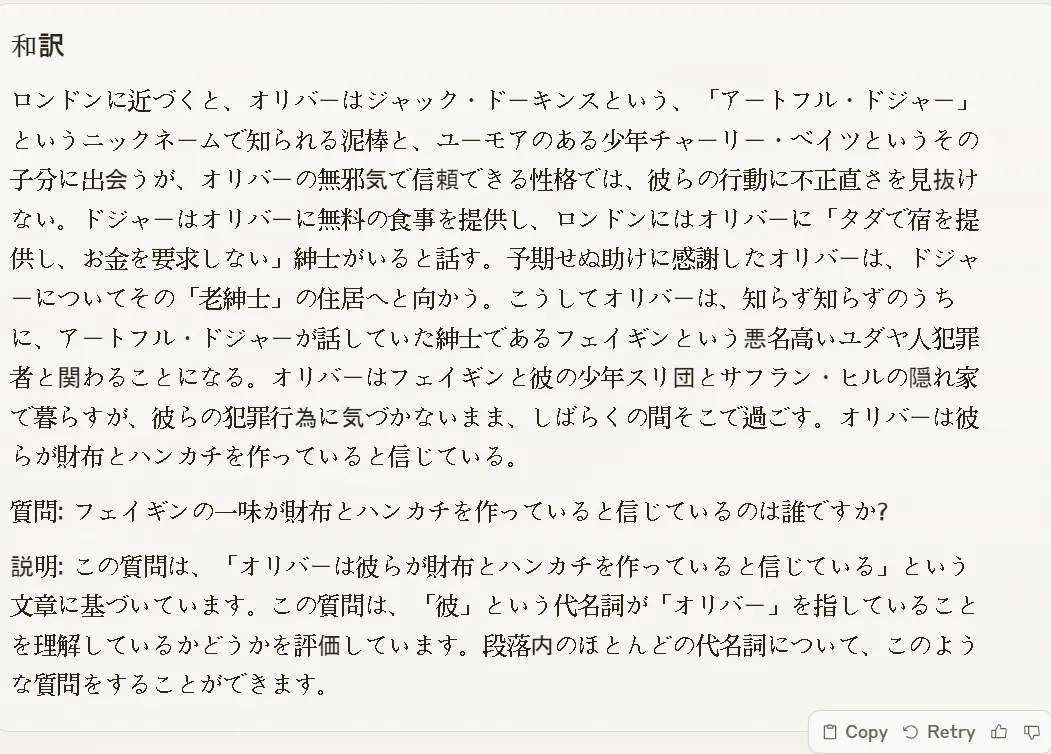 "出力": "フェイギンのギャングが財布とハンカチを作っていると信じている人はいますか?", "説明": "この質問は、文章「彼は、彼らが財布とハンカチを作っていると信じている」の次の文に基づいています。代名詞「彼」が名前「オリバー」を指しているという理解を評価します。段落内のほとんどの代名詞について、このような質問をすることができます。