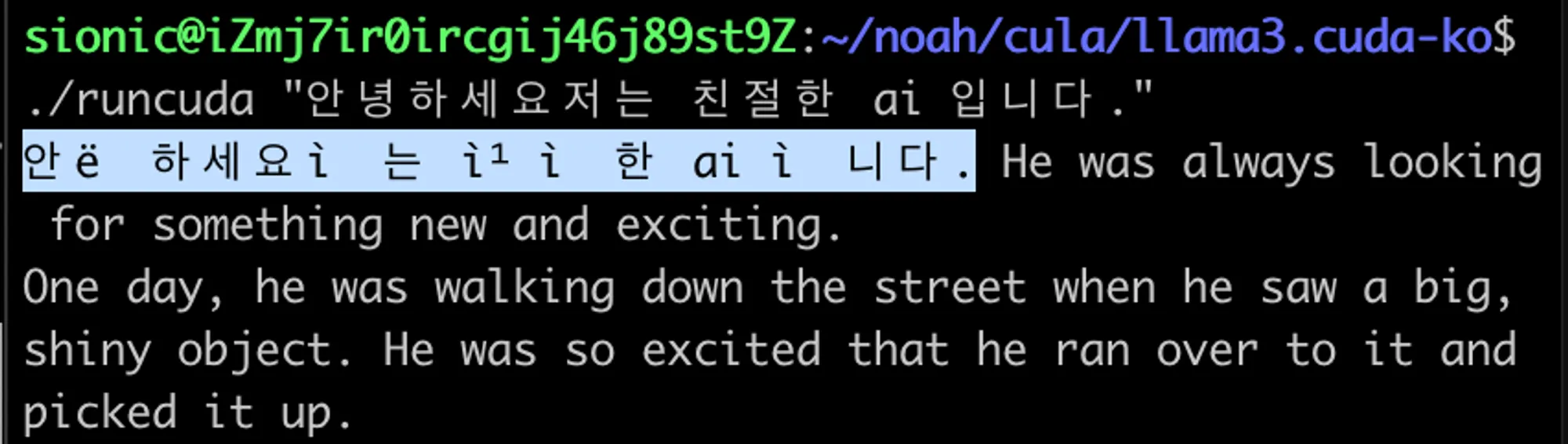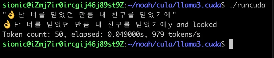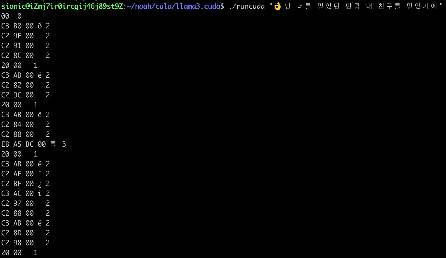 난 너를 믿었던 만큼(私はあなたを信じていた分だけ)’っていうハングルの歌の歌詞の文章が該当llama.cudaプロジェクトの出力構文で順番に出力されることが確認できます。