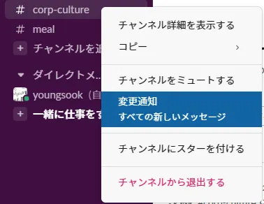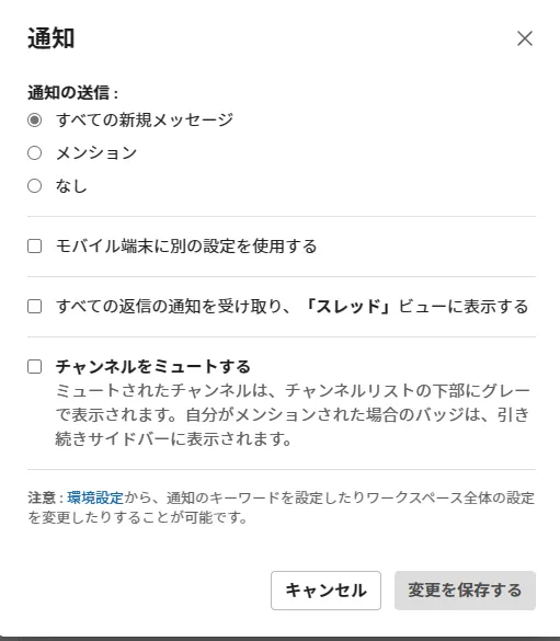 - 頻繁に訪ねるチャンネルではない場合は、「すべての新しいメッセージに通知する」よりも「メンションのみ通知する」オプションをお勧めします。